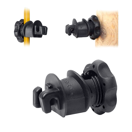 Izolator je izdelan iz UV obstojne plastike. Uporaben je za debeline palic od fi 10 d0 fi 14 mm. Skozenj lahko povlečemo elektro trakove 10 mm, elektro vrvice, elektro vrvi in pocinkano žico.